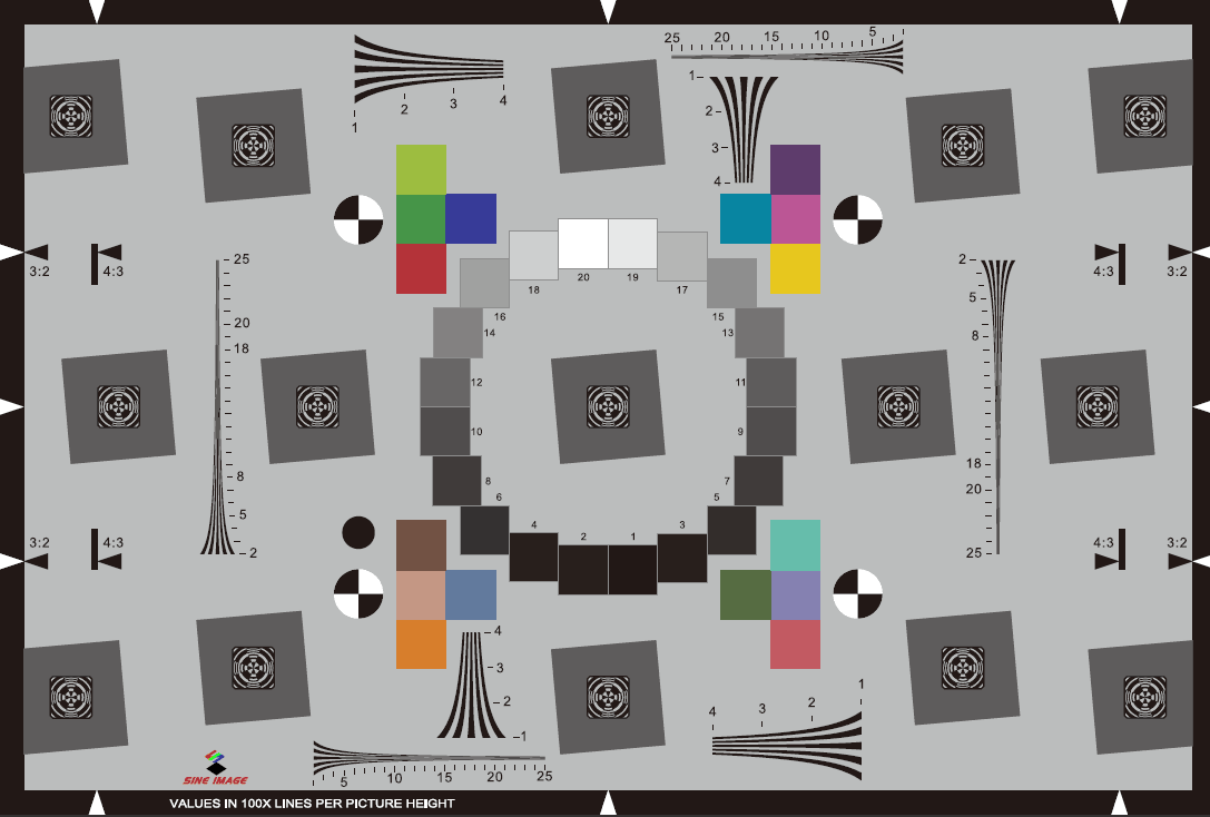 ISO12233:2014 eSFR分辨率测试卡标准版是3:2的长宽比。为了满足更多的测试要求我们增加了增强版和扩展版,增强版和扩展版在图像边缘增加了用于测试性能的方块,双曲线以及色块。这些图卡是完全符合标准的。