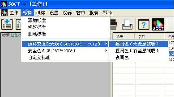 SQCT直接将《GB/T 18833-2012道路交通反光膜样》的多边形颜色区域做入软件中,可以直接从菜单中选择,“标样->道路交通反光膜GB/T 18833->昼间色(无金属镀膜)”如图11所示。