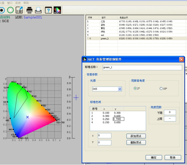 如图7所示,修改上面建立的名称为“green”的多边形-容差标样,先选中该标准,然后可 以修改“标准名称”“光源”“ 标准观察者角度”“亮度因数”“色品坐标”,修改完毕,点击“确定”按钮,则修改生效。