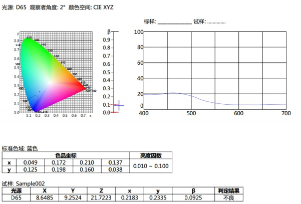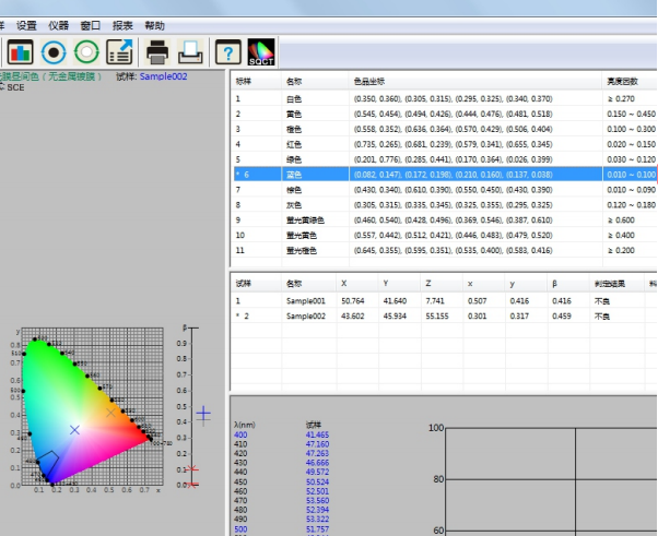 譬如如何判定蓝色试样是否在《GB/T 18833-2012道路交通反光膜样》所规定的蓝色区域内(无金属镀层,昼间反光膜颜色),按照下面的步骤,将依次完成测量和判定。