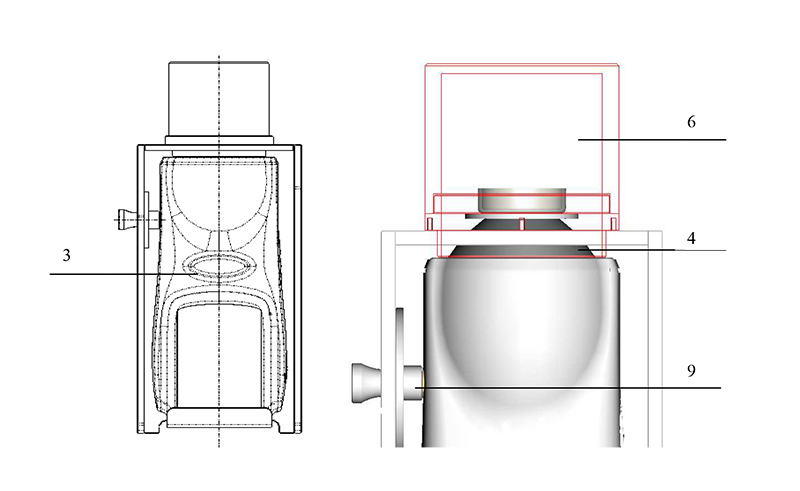 2、轻轻松开手拧螺丝8,使固定板7沿腰形孔可上下移动,使固定板7尽量处于下方位置;松开手拧螺钉2,使得手拧螺钉2的前端面稍低于螺钉固定座9的端面。