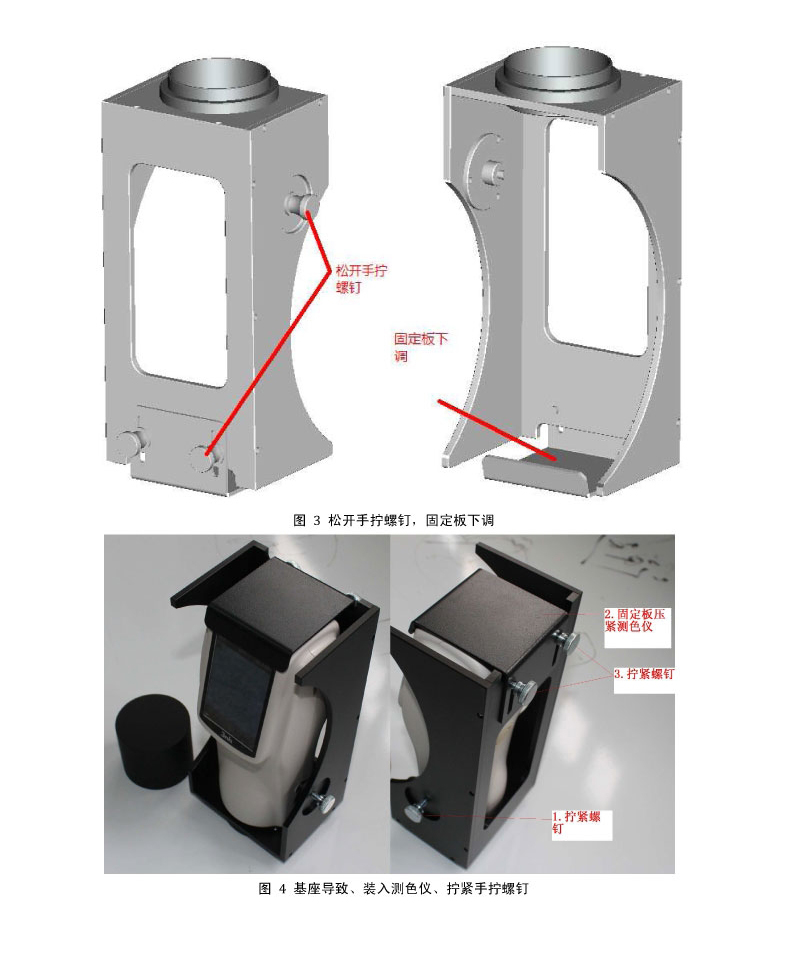 注意:确保测色仪固定稳固,确保测色仪测量口径一侧的台阶面紧贴黑腔底板的底面。