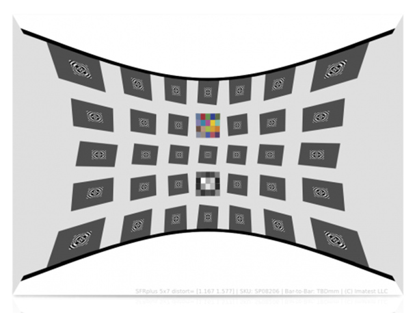 SFRPlus 汽车影像测试卡采用了预畸变的形式,适合超广角镜头的汽车影像或鱼眼镜头等极大畸变的摄像头的成像系统。